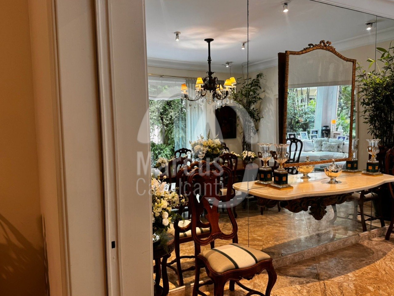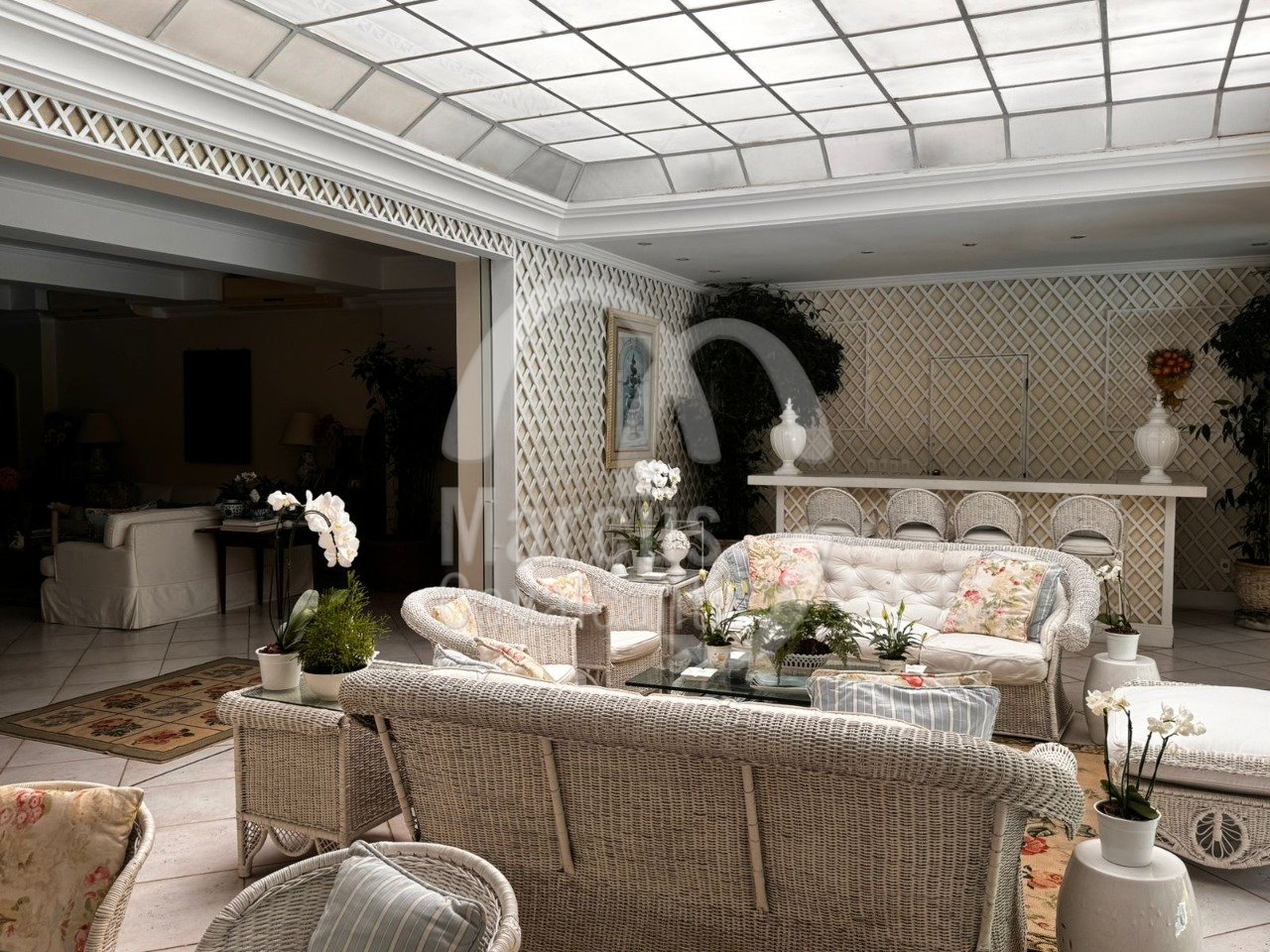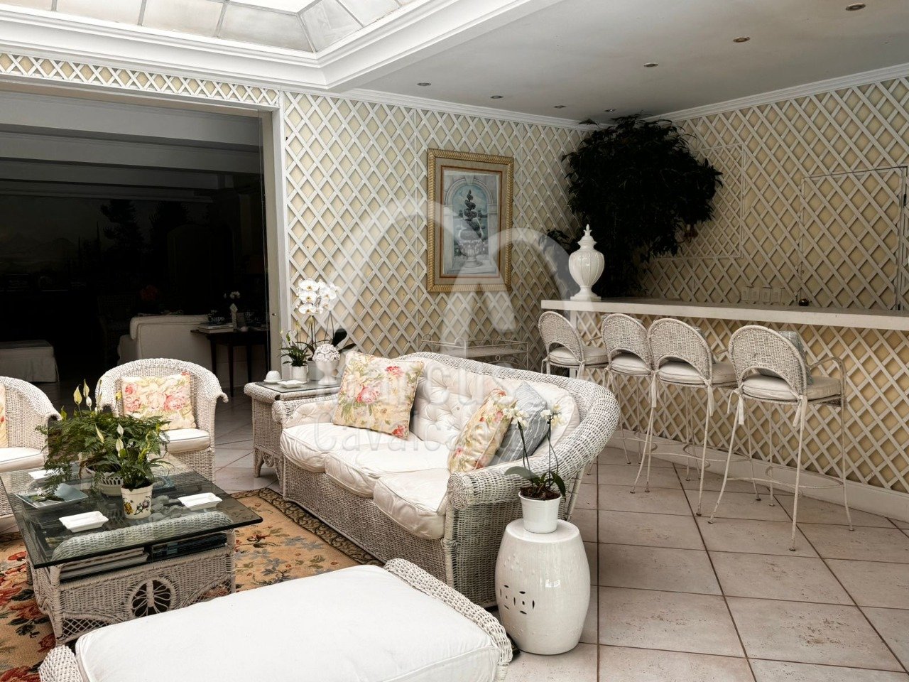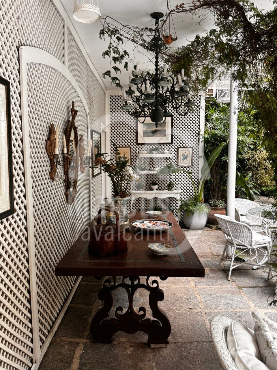 Grande salão, sala de jantar, varanda coberta como sala de estar. Muito agradável com requinte e bom gosto.