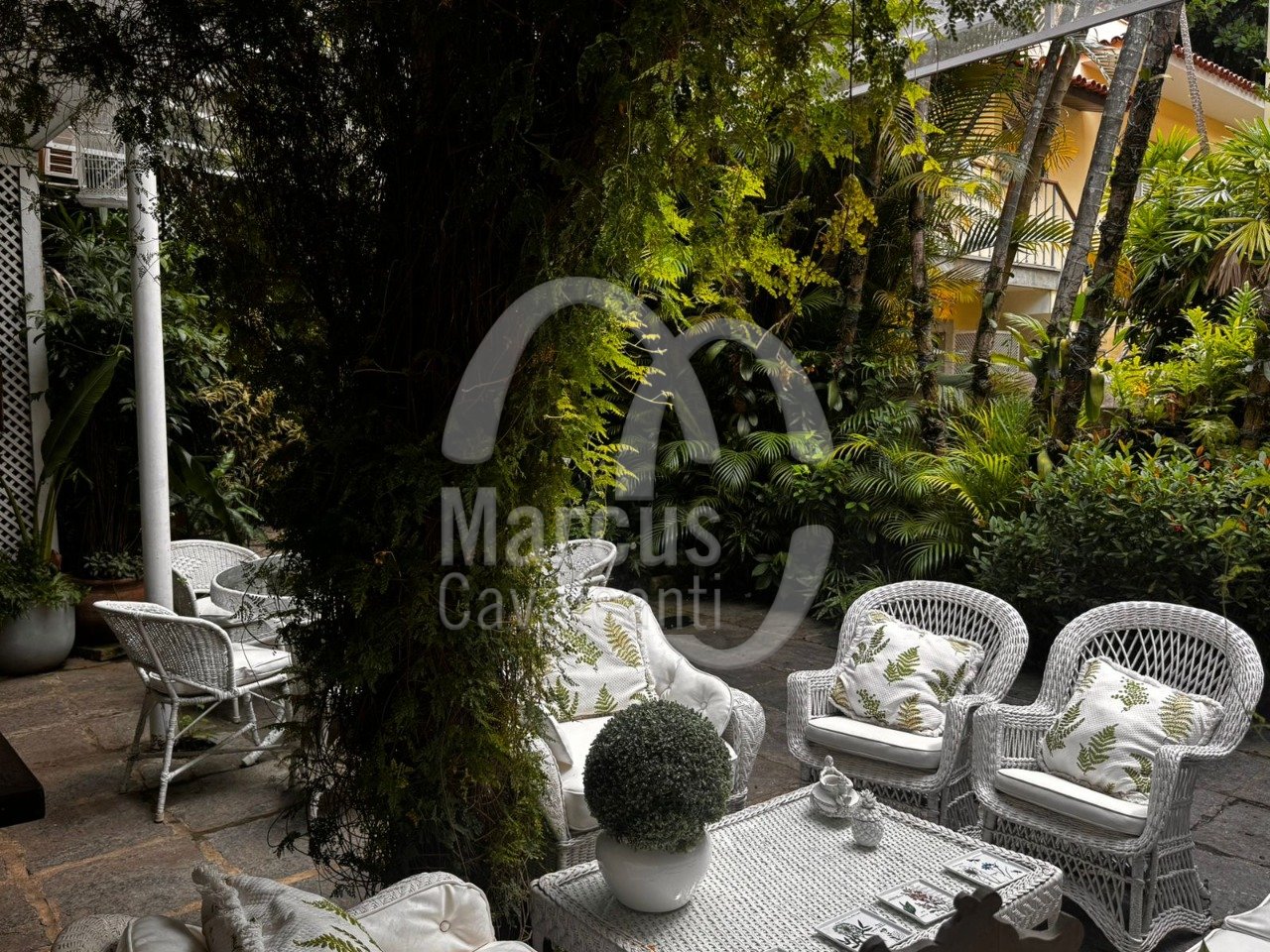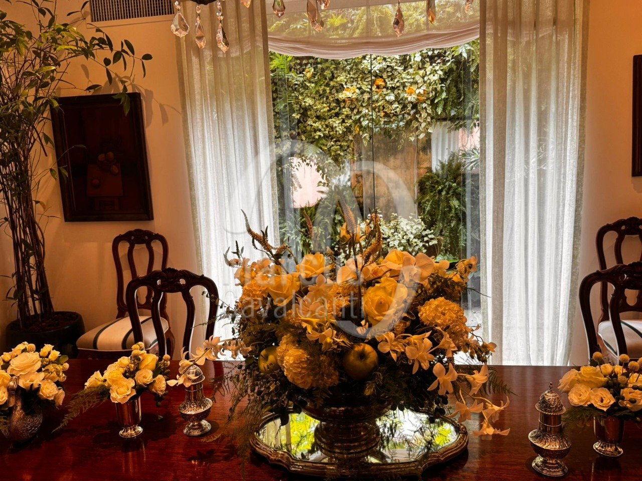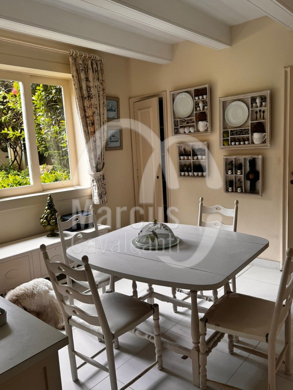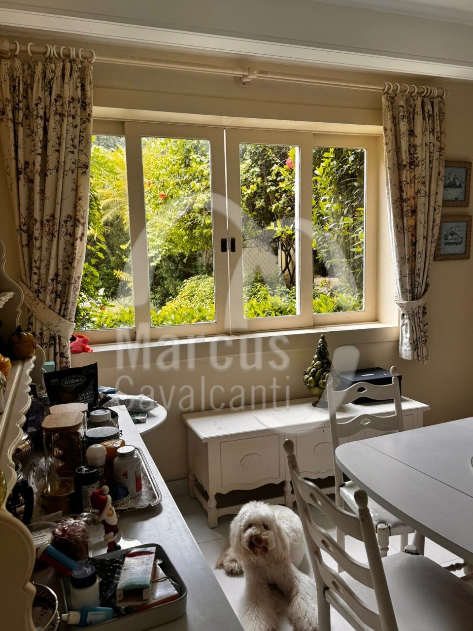 Grande salão, sala de jantar, varanda coberta como sala de estar. Muito agradável com requinte e bom gosto.
